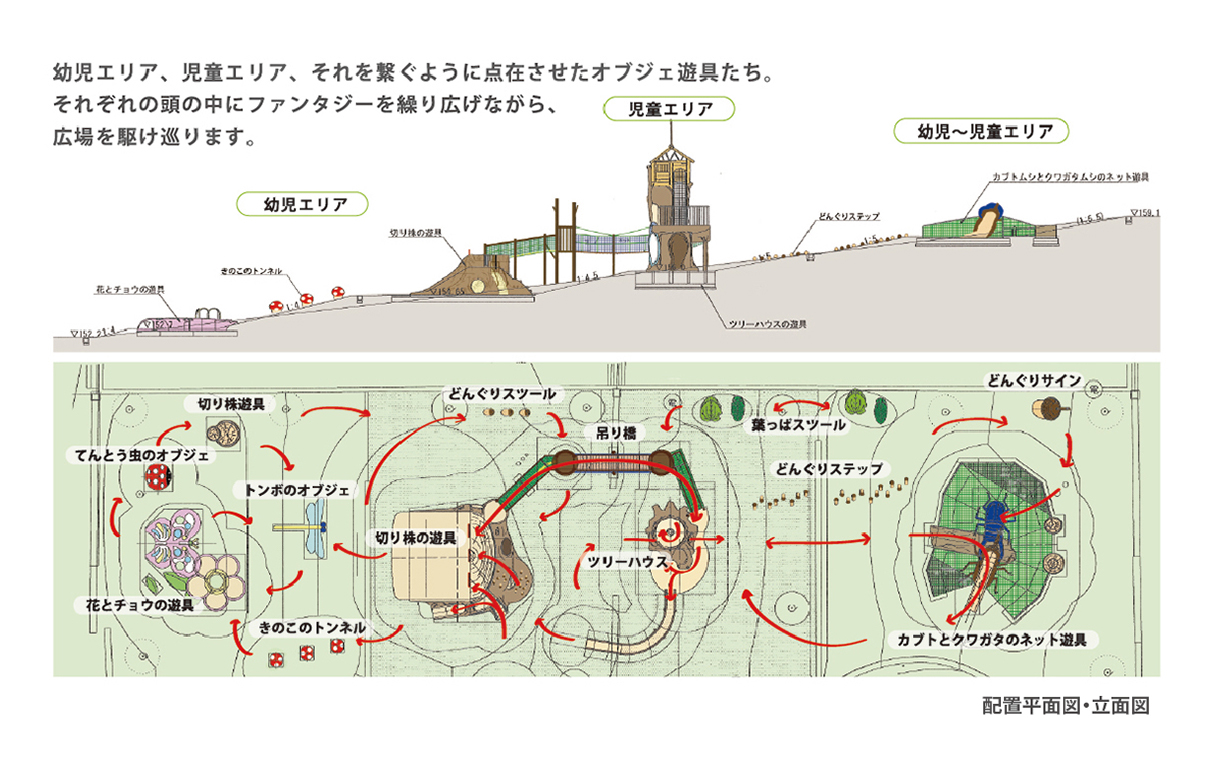 絵本の世界に入り込んだようなファンタジックな空間に遊具を点在させることで、エリア全体の回遊性を高め、遊びを通して豊かな想像力を育める広場を実現しました。