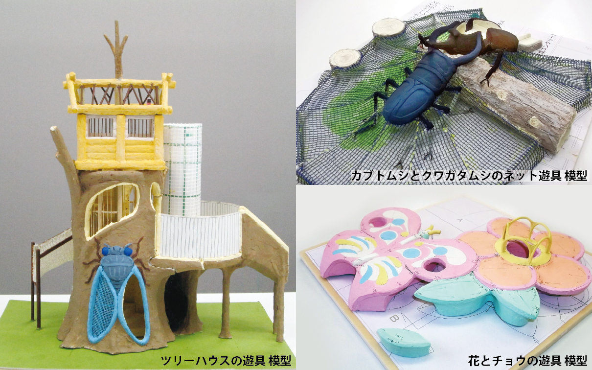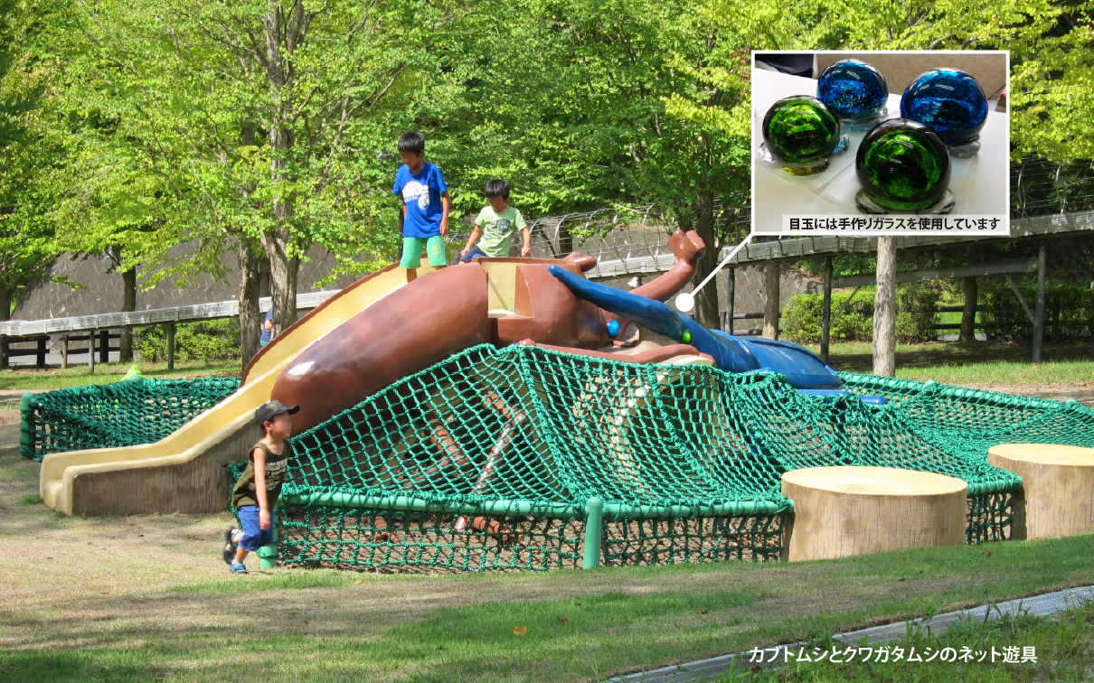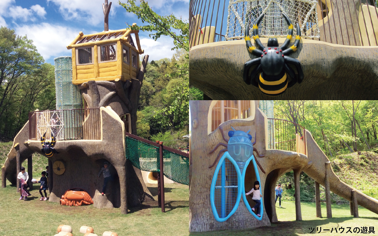 巨大な昆虫遊具は、自分が小さくなったかのような空想を誘い、秘密基地のようなツリーハウスは、子供たちの冒険心やチャレンジ精神をかき立てるデザインです。