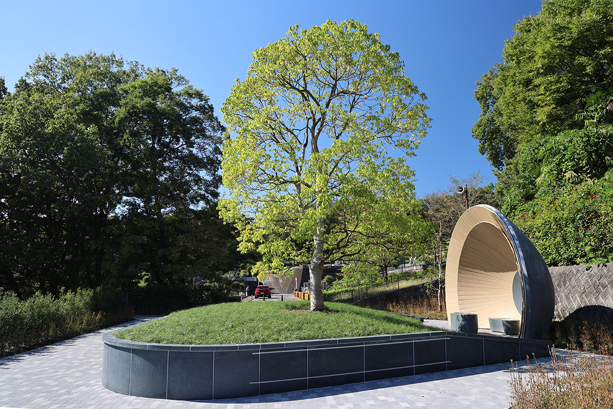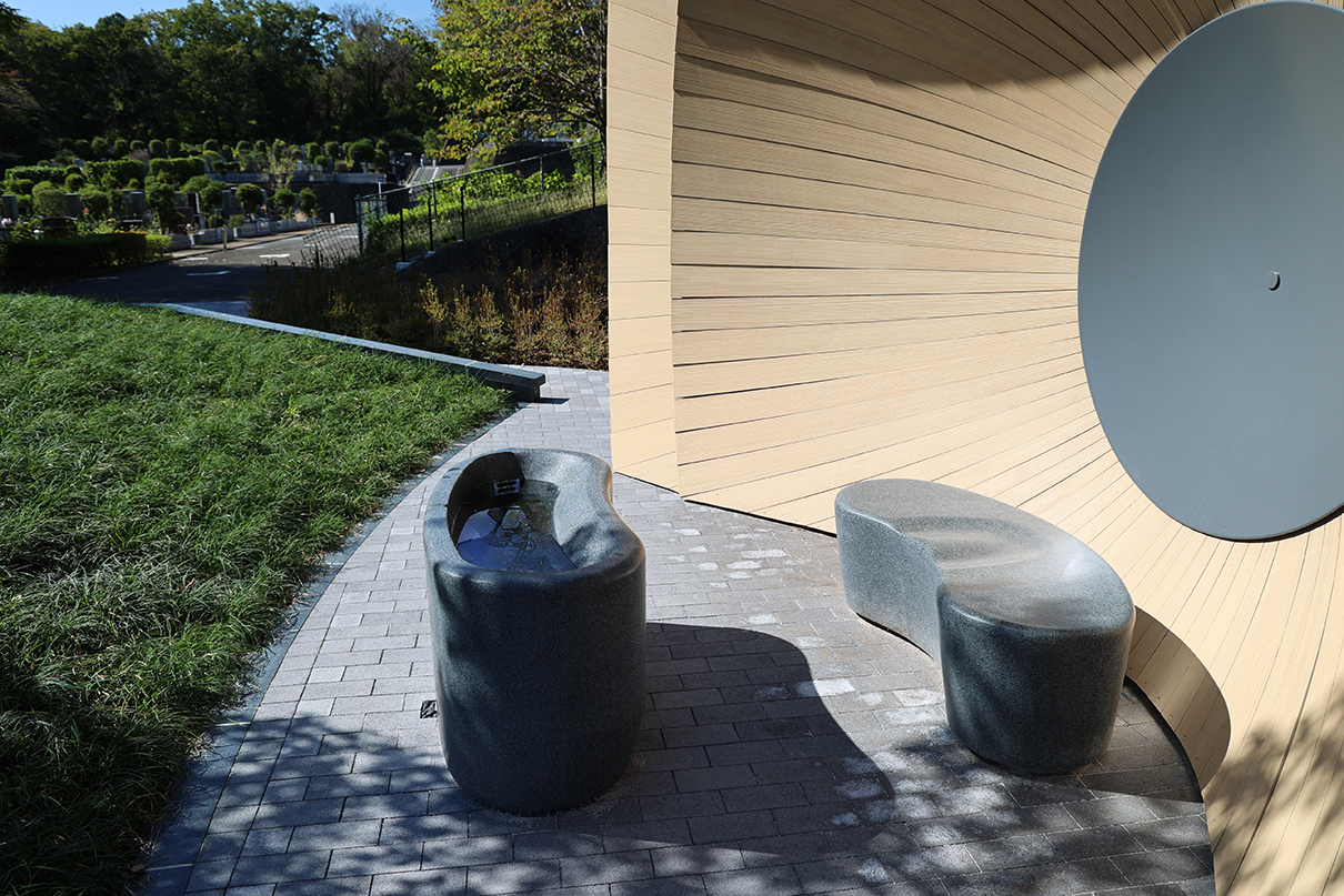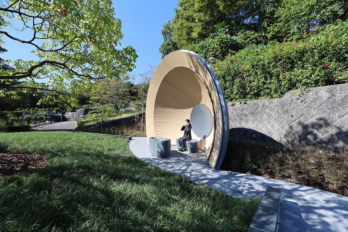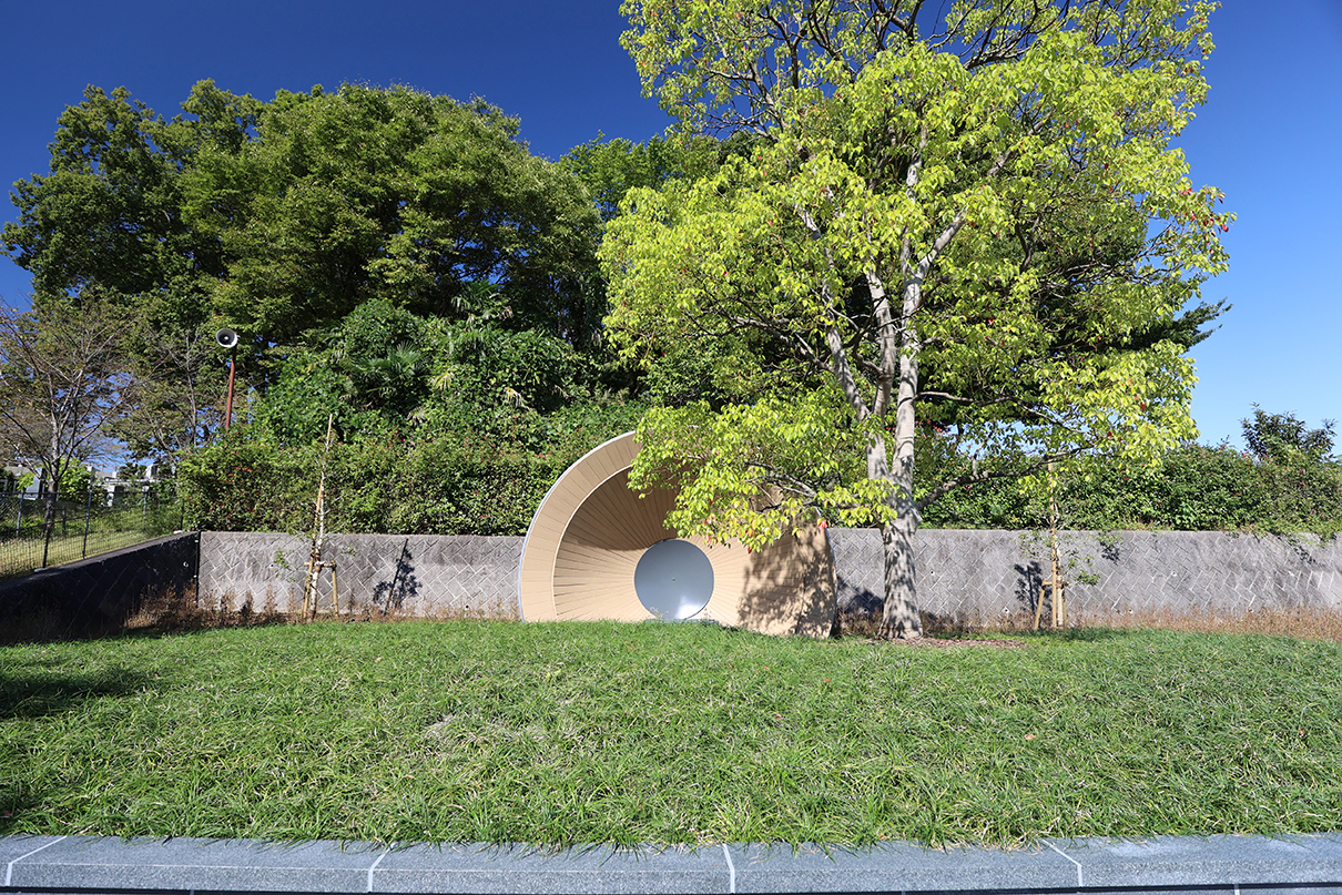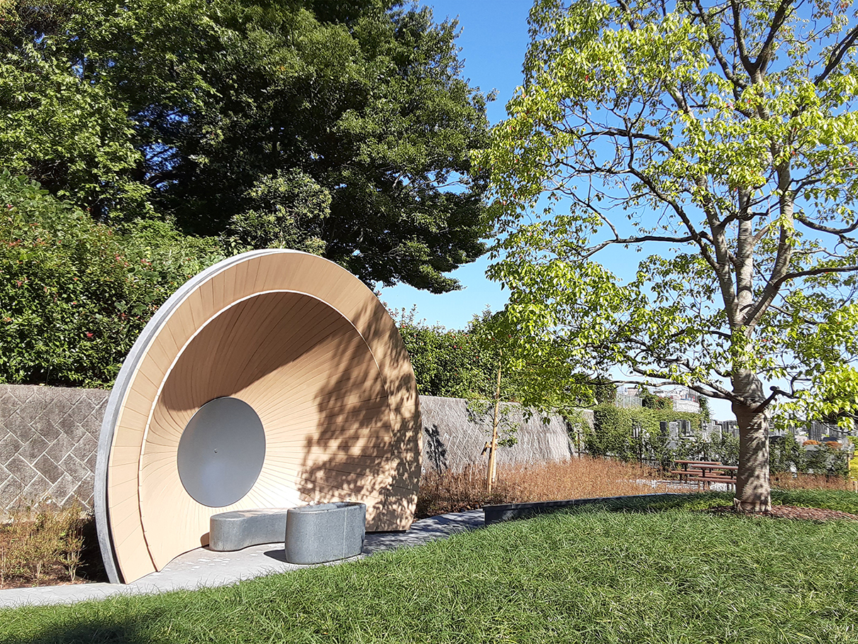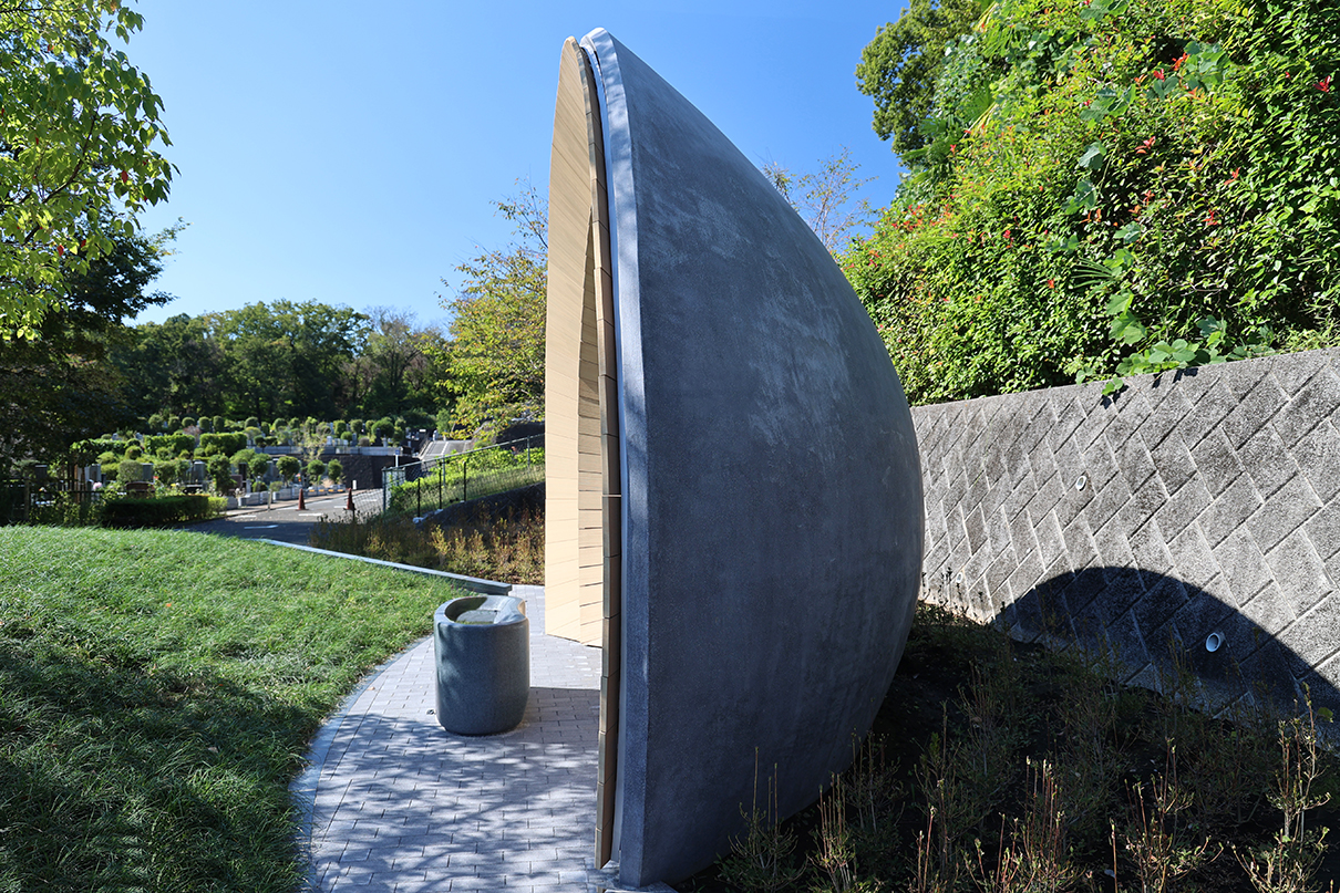 | 概要 | 中村拓志&NAP建築設計事務所が設計を手がけた「狭山樹林葬地」は、狭山湖畔霊園内の樹木葬墓地で、同事務所による管理休憩棟・礼拝堂へと連なる三部作の一つに位置付けられています。 地域の自然環境を背景とした「循環の死生観」のもと、森を遥拝することで、森に還った故人を偲び、対話できるような建築となることを目指して設計されています。 樹林葬地では、この地にあったクスノキと森を墓標とし、中心には高さ約1mの緑の丘状の墓所が設けられています。その先60mに位置する森へと視線が導かれるよう、祈りやお参りのための礼拝所が配置されています。 礼拝空間は、屋根と壁が一体となった放物面形状により構成されています。 その曲率は、遠方から届く微弱な音を一点に集めるように作用し、遠くの森の気配へと意識が向けられる空間となっています。 アンスは、この特徴的な礼拝空間の実現に向け、設計協力および構造検討、製作・施工を担当しました。 特に、複雑な曲面形状をもつモルタル造形屋根については、弊社独自工法である高度造形モルタル工法を採用し、形状検討から構造的成立性の検証、製作・施工に至るまで一貫して携わりました。 緻密に設計された曲率を左官による手作業で仕上げる工程は難度が高く、施工にあたってはゲージを用いた形状管理などの工夫を行っています。 こうした設計協力から製作・施工に至るまでの一連の取り組みにより、意匠で求められた精度の高い曲面形状の実現を支えています。 |